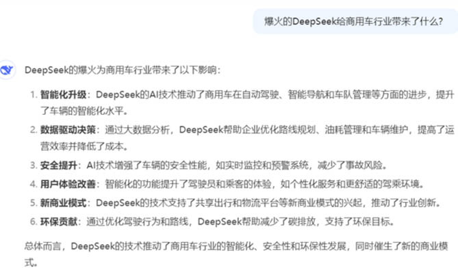 当然,对于行业企业来说,DeepSeek的开源模式,给商用车企业在需求导入、产品开发、生产及管理等多个方面以助力,对于物流企业也有更多场景上的助力。