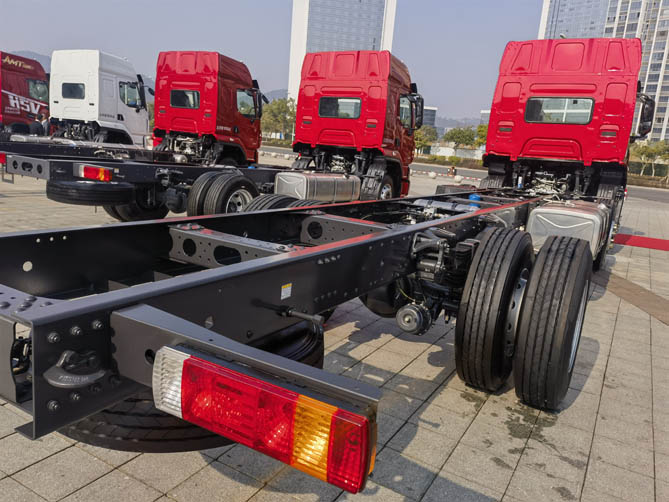 乘龙H5 350马力载货车,采用6×2双导向驱动。这种形式的好处是相比6×4形式车身更轻,导向更灵活。当然,这款车的轻,还体现在整车的轻量化方案上,前文提到发动机、变速箱均采用了轻量化设计,此外还包含264mm车架、铝合金油箱、储气筒、轮端等的轻量化方案。