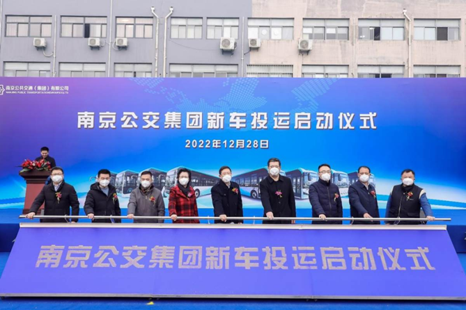 12月28日上午,南京公交集团在古平岗停保场举办2022年首批新车投运启动仪式。市交通运输综合行政执法监督局局长刘向东,市城建集团党委副书记尹小峰,市交通运输局运输管理处处长陈兆栋,市交通综合执法局一支队支队长邓智勇,六合区交通运输局党委副书记徐龙瑞,南京市城