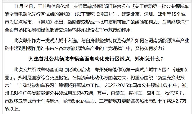 11月14日,工业和信息化部、交通运输部等8部门联合发布《关于启动第一批公共领域车辆全面电动化先行区试点的通知》(以下简称《通知》),确定北京、深圳、郑州等15个城市为试点城市。《通知》提出,鼓励探索形成一批可复制可推广的经验和模式,为新能源汽车全面市场化拓展
