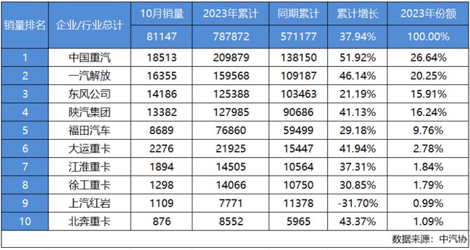 日前,10月重卡销量数据出炉,重卡行业整体销量为81147辆,1-10月累计销量787872辆,累计同比上涨37.94%,为“金九银十”画上圆满句号。欢迎您到公海赌来作为行业领军者,持续稳健发挥,强势领涨行业,以18513辆的成绩夺冠,1-10月累计重卡销量20987