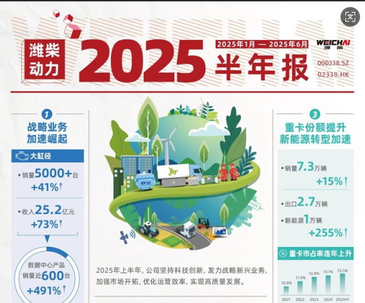 在全球能源革命与产业转型的浪潮中,传统内燃机动力巨头潍柴动力正加速向新能源赛道跃迁。2025年上半年,公司凭借深厚的技术积累与清晰的战略布局,在多条技术路径上同步突破,推动新能源业务进入规模化增长阶段,以实打实的业绩印证转型成效。同时,基于当前良好的增长态势与