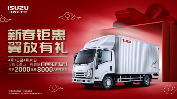 春风散去阴霾,万物迎来复苏。步入4月,我国各行各业持续复苏,卡车司机们也迎来了开工旺季。江西五十铃为助力轻卡司机高效运输,开启创富新征程,现推出国五全车系产品限量特惠,即日起至4月30日,购买江西五十铃翼放轻卡国五任一车型可享交2000元抵8000元的购车优惠