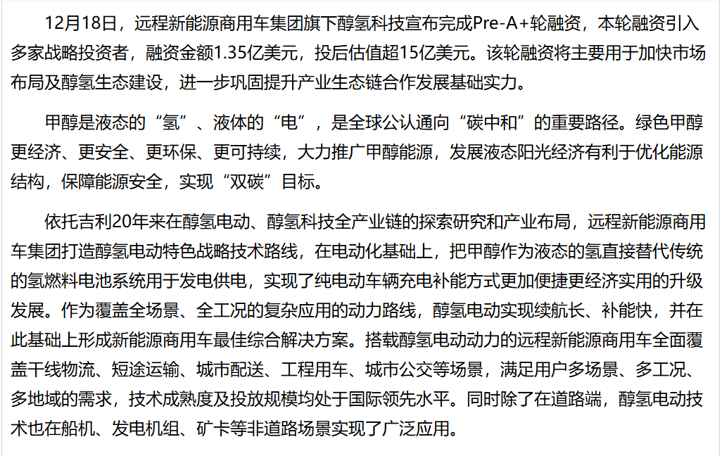 12月18日,远程新能源商用车集团旗下醇氢科技宣布完成Pre-A+轮融资,本轮融资引入多家战略投资者,融资金额1.35亿美元,投后估值超15亿美元。该轮融资将主要用于加快市场布局及醇氢生态建设,进一步巩固提升产业生态链合作发展基础实力。甲醇是液态的“氢”、液体