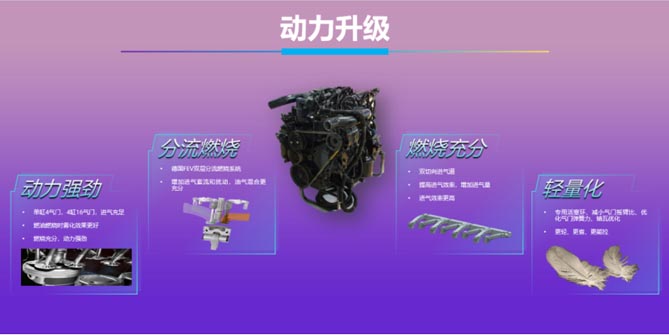 采用德国FEV双层分流燃烧系统,燃油雾化效果更好。搭配双切向进气道,进气效率更高,燃烧更充分,动力强劲,经济省油。活塞环、气门弹簧、轴瓦等零部件全部优化,更轻更省更能拉。