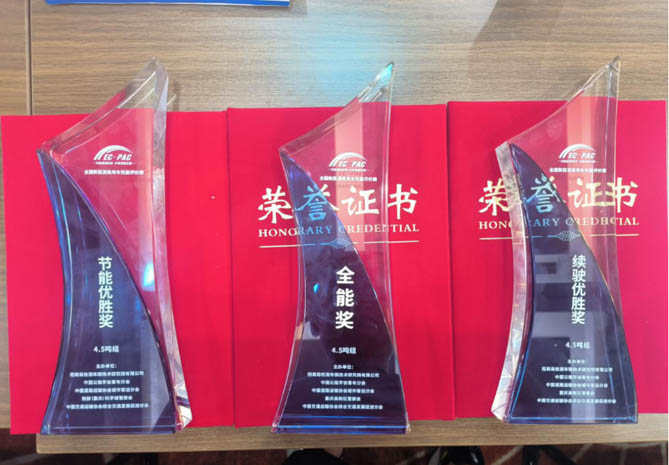 荣获2024 EC-PAC全国新能源商用车性能评价赛中4.5吨组唯一一个全能奖和节能优胜奖、续航优胜奖两个单项奖,帅铃ES6实至名归。此次获奖是江淮1卡帅铃ES6纯电轻卡的绝对实力,也是行业权威赛事对江淮1卡新能源商用车的认可。今后,江淮1卡将继续发挥在新能源商用车的领先优势,为用户打造效率更高、续航更可靠、动力更强、更具运营价值的创富工具,推动新能源汽车不断向前,为绿色低碳美好未来助力。