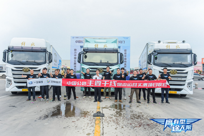 6月12日,在国家物流枢纽城市沧州传化物流园内,随着解放鹰途商务舱、头等舱、生活舱三辆车依次穿过收官门抵达指定位置,运联研究院实测成员和实测项目成员的车队全部抵达,此次“中国公路主要干线物流运营实测项目”正式收官。