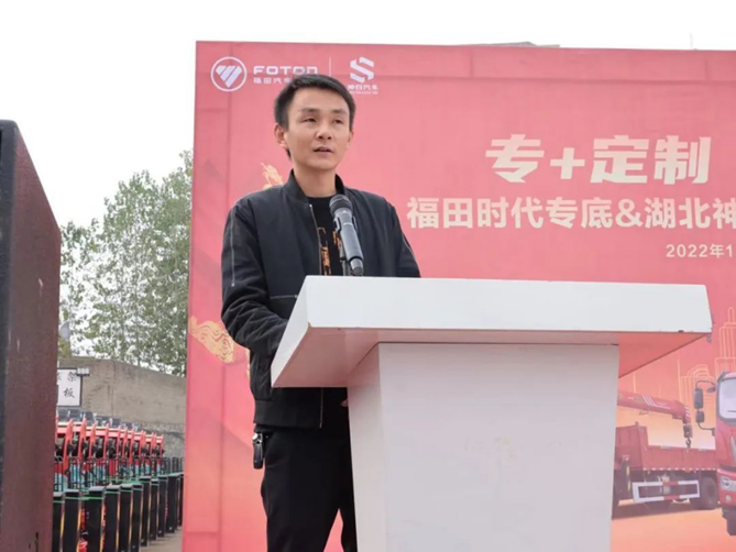 会议开始,福田时代专底营销公司随州中心总监孙海滨进行致辞。他表示,福田汽车作为商用车行业的第一品牌,连续17年蝉联商用车销量第一。福田时代专底作为事业部乃至集团重点推进品牌,向内依托福田汽车雄厚实力,以专业科技实力赋能专底产品智慧运营,并根据上装要求进行专业底盘设计,全面满足全场景,多元化使用。向外福田时代专底将链合改装企业资源,为专用车用户提供全方位一站式服务。此次与湖北神百集团的强强联合,更是在建立深入合作机制基础上,充分发挥各自优势,合力共赢,共同推动双方发展迈上新台阶。