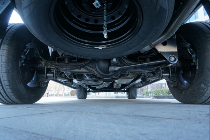 从曝光的底盘图片来看,新车采用前双叉臂+后多连杆整体桥悬架,构成一副十分强悍的硬派越野骨架,带来了更好的通过性。
