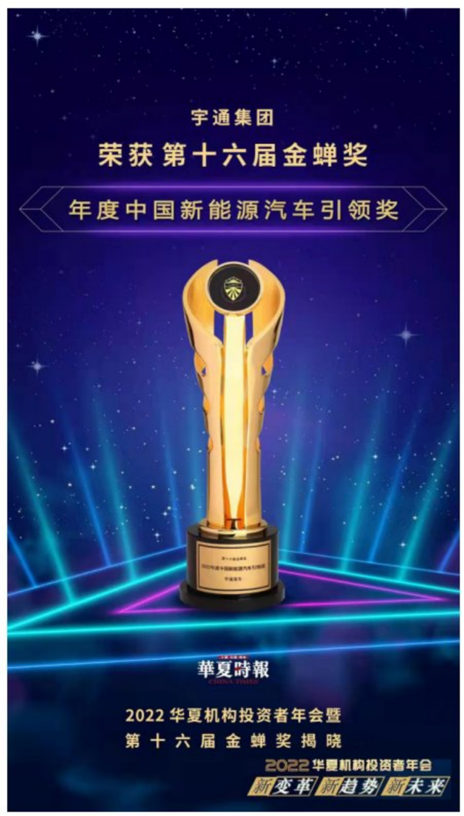 2023年1月6日,由《华夏时报》主办的“新变革 新趋势 新未来——2022 华夏机构投资者年会暨第十六届金蝉奖”揭晓,宇通集团荣获“2022年度中国新能源汽车引领奖”。