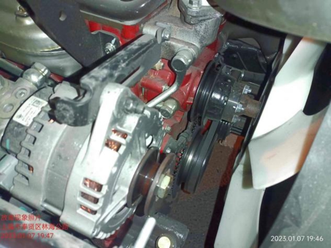 江淮1卡上海奥狮服务站与樊老板取得联系后,通过电话询问故障表现,初步判断了故障原因,携带好相关配件与工具后立即驾车出发。20分钟后,维修人员到达樊老板所在报修点,经检查后发现,发电机风扇皮带脱落导致水温异常。看到这里,樊老板这才想起来跑上一趟运输的时候车辆已经在报警了,因为赶着送货,一着急就忘记检查了,这才出现发动机高温报警。