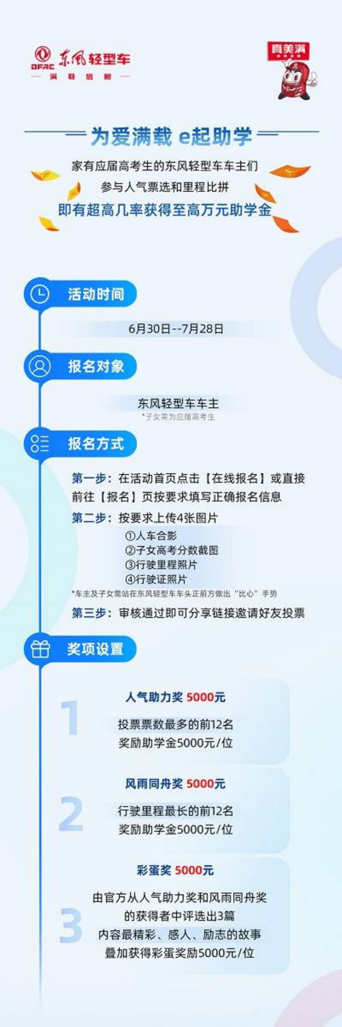 此次“为爱满载 e起助学”公益活动,所有家有应届高考生子女且高考分数达到当地大专分数线及以上的东风轻型车车主均可参与,最终将从参与报名的车主中审核评选出24个助学金名额,进行专项资助。评选分为“人气助力奖”和“风雨同舟奖”两个方向进行:通过投票评选出票数最多的12位入选“人气助力奖”;根据目前车辆行驶里程数评选出行驶里程最长的12位获得“风雨同舟奖”。24名车主每人将获得5000元奖励。同时特设彩蛋奖:由东风汽车股份从以上获奖者中,评选出3篇内容最精彩、感人、励志的故事叠加获得彩蛋奖励5000元/位(该3名车主每人至高可得1万元助学金)。