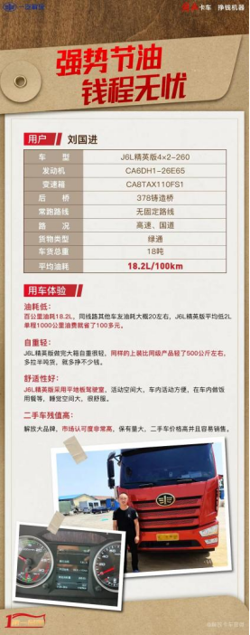 出于职业习惯,卡车司机刘国进师傅看来,油耗一直是他最为关注的。平时,无论是高速还是国道,他总能保持百公里油耗18.2L左右。刘师傅说:“要想降低油耗,选车是第一步。”他所驾驶的是一辆解放J6L精英版260马力载货车,车辆采用了解放独有的体系节油技术:比如轻量化设计、低滚阻轮胎,空气动力学优化、轻量化底盘等。他说:“我非常满意这台车的节油性能,在外跑长途拉绿通,这车百公里油耗平均18.2L,相较同线路其他车友油耗低了近2L,单程1000公里油费就省了100多元,若按照年来计算,轻松能省一万多块钱!极大节省了运营成本。”