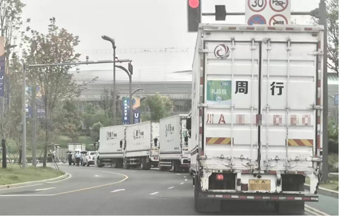 这些卡车中装载的是观众礼品包,包括雨衣、扇子、荧光棒、毛巾、赛事手册等,不仅数量庞大,并且需要频繁出入场馆区域,对于装卸效率有极高要求。为此,车队采用了兼顾大运输空间及装卸效率的乘龙8.3米气囊飞翼车作为运输车辆。
