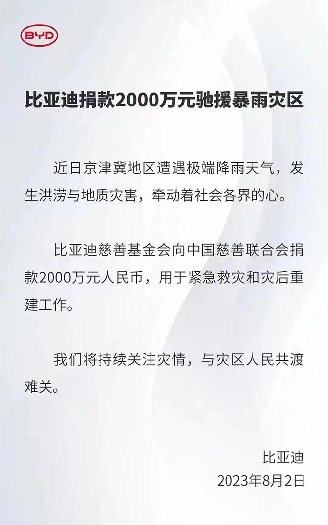 比亚迪向京津冀暴雨灾区捐款2000万元