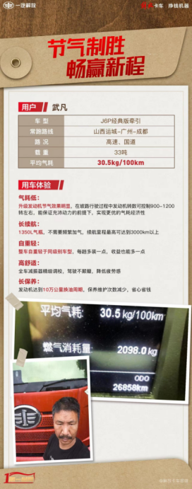 王子红是一名经验丰富的卡车司机,他新购入的解放J6P经典版LNG牵引车,动力强劲,加速迅猛,让他竖起大拇指,频频称赞。他驾驶着这台车来往于山西孝义和新疆一带运煤,线路以国道为主。日常载重约33吨,平均气耗为33.8kg/100km。超低的气耗得益于解放全新升级的发动机,在坡路行驶过程中,发动机转数可控制在900-1200转左右,能够保证充沛动力的前提下,实现更优的气耗经济性。
