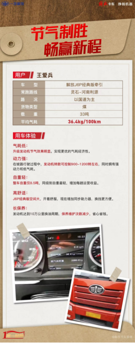 卡车司机王爱兵,生活中是一位精打细算的人,他在选购运输车辆时格外注重性价比和实用性。他介绍说,“我在山西与河南这条线路上从事煤炭运输,最看重的就是车辆的自重,解放J6P经典版LNG牵引车采用新材料、新工艺、新结构多项降重措施,整车自重仅8.5吨,是同级别产品中最轻的。这就意味着,同样条件下,可以多拉多赚。”