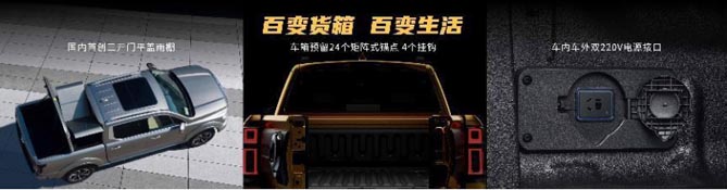 此外,山海炮性能版拥有开放式百变后车箱、出厂自带C6拖挂牵引资质,满足3.3吨拖车认证、国内首创三开门平盖雨棚,电动控制,可拆卸隔断,增加空间百变性,玩转全场景皮卡车生活。