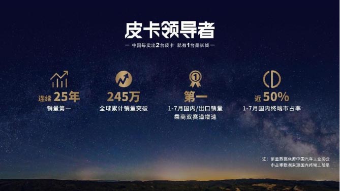 中国只有两种皮卡,一种是长城,一种是其他。长城皮卡已连续25年销量第一,全球累计销量突破245万。今年1-7月长城皮卡国内/出口销量双第一、乘商双赛道增速第一,国内终端市占率近50%,中国每卖出两台皮卡,就有一台是长城。长城炮已累计35个月销量过万,蝉联皮卡销量冠军。8月18日长城炮品牌四周年,更迎来第50万台整车下线,成为首个突破50万台的中国高端皮卡品牌,以现象级的“长城炮速度”,开启中国智能豪华皮卡新篇章。