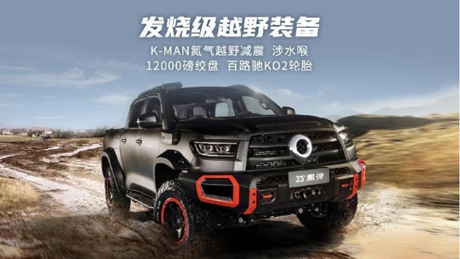 个性化定制共创新品2023款黑弹,焕新上市,官方指导价25.88万元,用户通过长城炮APP即可订购,首批300名下订用户,可获赠车尾防滚架,先到先得。