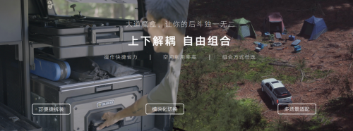 所谓大道魔盒,其实就是后斗改装,只是和传统的改装有很大的区别。它可以与大道货箱的基座实现无缝连接,轻松拆卸,托盘、抽屉、边柜等组件都能自由组合,自由分配。简单来说,这是一个可以随便DIY的区域,它能用来做什么,完全取决于用户的需求。比如,喜欢野外垂钓,就可以将魔盒DIY成自己专属的钓鱼版;热衷于探索远方,就可以将魔盒DIY成专属于自己的穿越版。