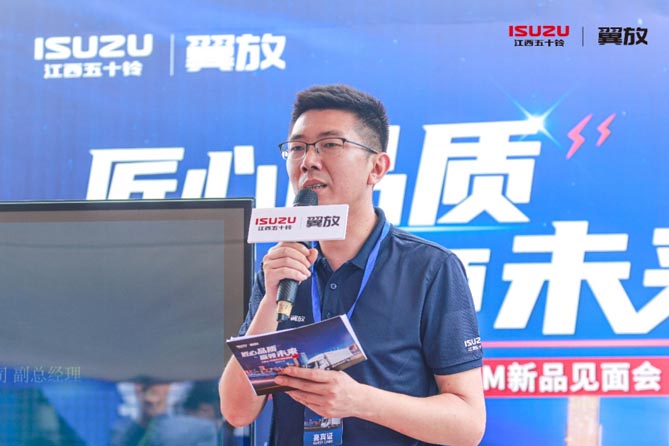 随后,江西五十铃汽车销售有限公司轻卡市场部经理郑洲先生向与会嘉宾详细介绍了翼放EM的硬核实力,从动力、省油、可靠、承载、安全、舒适等方面介绍了翼放EM的全新特性和产品优势。翼放EM搭载江西五十铃4JD2发动机,最大功率达到112kW,最大扭矩达到400N·m,如此强劲的动力,翼放EM传承了五十铃轻卡的省油特性,通过五十铃发动机技术加持、动力链系统的优化、全车多项技术创新,油耗在同级产品处于领先水平。翼放EM作为五十铃高品质轻卡,采用日本五十铃IMM生产管理系统,严格的质量管控流程,建立了全球一流的供应商体系,保障产品品质。此外,翼放EM还具备同级领先承载、极致安全和人性化舒适设计等多项产品优势,在满足广大轻卡用户多种使用场景需求的前提下,给予用户极致的安全呵护和舒适的驾乘感受。