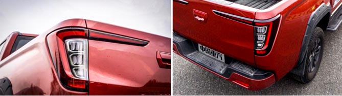 外观呈现立体、奔放的美式皮卡造型风格,前脸高度整合,格栅和大灯采用一体式设计,强化车头的视觉冲击力,整车行驶中远观犹如猛虎出山、蛟龙入海,凌厉霸道。
