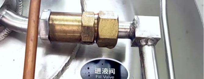 务必佩戴手套操作气瓶上的出液阀、增压阀、放空阀,避免低温冻伤。顺时针旋转为关闭阀门,逆时针旋转为开启阀门。开启阀门到最大角度时,建议回转10-20度,以避免低温结冰冻住阀芯。如果阀门被冻住,也不要用锤子和撬棍敲击,应该用温水持续浇注,融化冰霜后再对阀门进行操作。