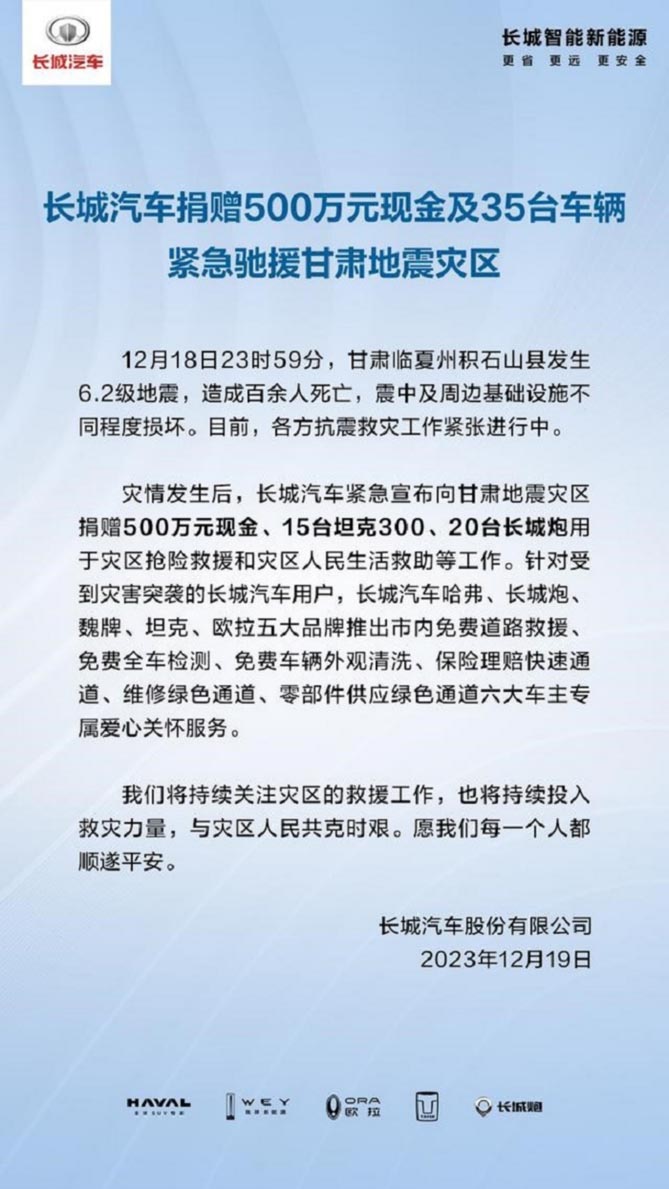 12月18日,甘肃发生6.2级地震,给当地民众生命财产造成重大损失。灾情发生后,长城汽车立即行动,紧急向甘肃地震灾区捐赠 500 万元现金、20 台长城炮、15 台坦克 300用于灾区抢险救援和灾区人民生活救助等工作。