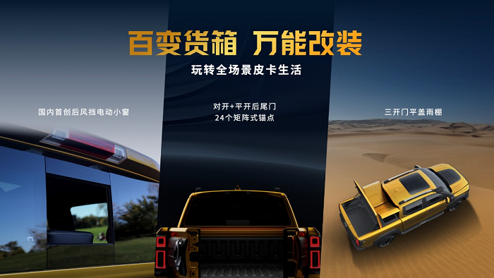 此外,山海炮性能版还拥有丰富多变的功能设计,以百变货箱、万能改装满足户外百变生活需求。国内首创后尾门对开+平开设计,车箱预留24个矩阵式锚点、4个挂钩,车内车外双220V电源接口贴心设计,助力用户玩转全场景皮卡车生活。原厂自带C6拖挂牵引资质,满足3.3吨拖车认证,可拖挂房车、摩托艇、游艇等,为玩家解锁更多创意玩法。