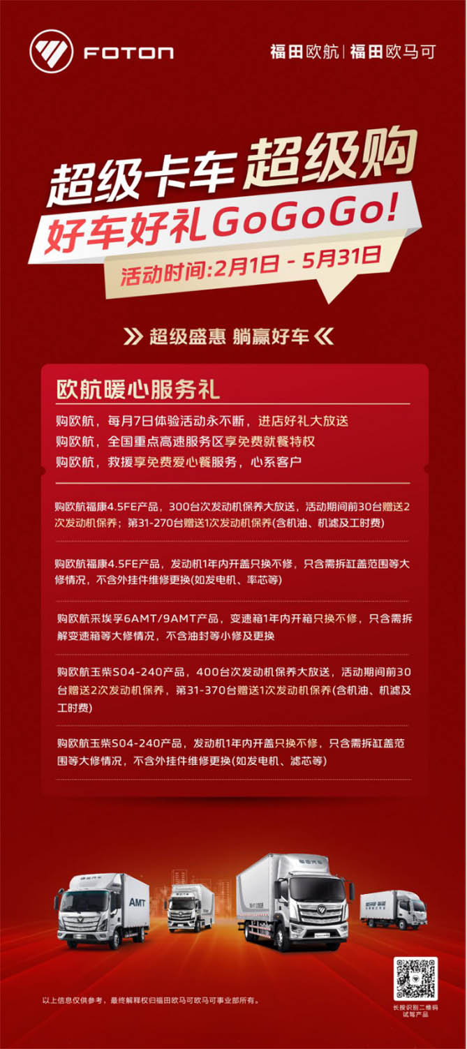 随着春节假期结束,各行各业纷纷摩拳擦掌开启新一年征程,为助力新老卡友在新的一年以更高效的运输装备创造更高的运营价值,欧航推出“超级卡车超级购 好车好礼GoGoGo”活动,即日起至2024年3月31日,新老客户购买欧航指定车型可享订车礼、0利率金融礼、千元补贴置换礼、暖心服务礼、黑卡会员礼五大专属礼遇,以超值的价格享受高品质的购车体验,解除卡友后顾之忧,助力卡友开工大吉。