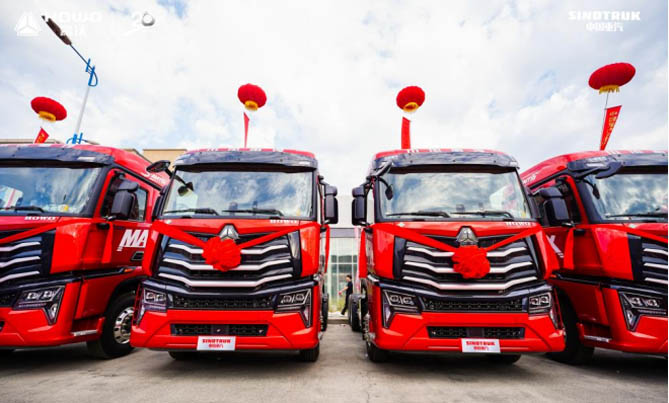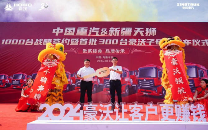 活动现场,豪沃重卡与新疆天狮的1000辆战略签约仪式与300辆豪沃子母车的荣耀交付共同铸就了庆典的辉煌时刻。金钥匙的传递,不仅是车辆所有权的交接,更是双方信任与合作的象征。在豪沃高端高效产品的加持下,新疆天狮将进一步提升煤炭运输效率,降低运营成本,为新疆乃至全国的能源供应贡献力量。