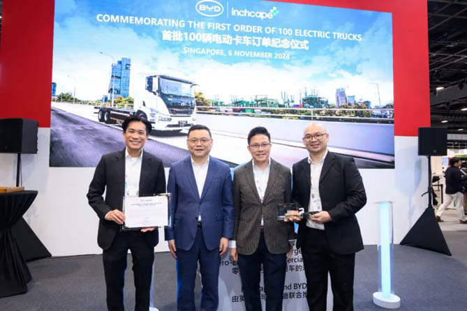 在现场,比亚迪还与Inchcape(经销商)举行首批100台电动卡车T9R订单纪念仪式,这是比亚迪在新加坡电动重卡的最大单笔订单,车辆预计在2025年第二季度交付,助力新加坡政府的绿色计划2030实现。