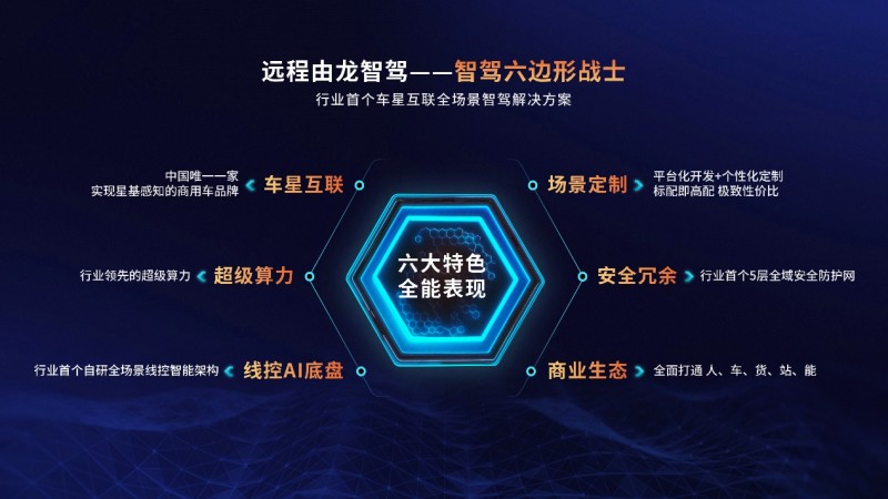 基于原创自信的开发理念和大吉利技术资源储备,由龙智驾具备车星互联、超级算力、线控AI底盘、场景定制、安全冗余、商业生态六大核心亮点,成为智能驾驶中的六边形全能战士。在线控AI底盘技术加持下,线控转向可以实现50ms快速响应,线控制动系统响应时间小于等于150ms,相比于传统真空制动刹车系统制动距离可以缩短25%,真正做到毫秒响应,堪比老司机的经验;在算力方面,远程依托吉利“云、数、智”一体化超级云计算平台——吉利星睿智算中心,形成了行业领先的算力资源储备,云端总算力达102亿亿次/秒,并在车端布置了总算力高达508TOPS的车载智驾芯片方案,达到了乘用车第一梯队的算力水平,庞大的用户体量实时产生海量数据资源,为远程智能化的持续进化提供源源不断的数据支撑;此外远程更是中国首家实现星基感知的商用车品牌,采用车星互联技术,为用户提供全时、全覆盖、高速、高可靠的通信链路以及厘米级高精度全球导航,让车辆永不掉线,目前在轨共30颗卫星,可实现24小时全球90%区域覆盖。