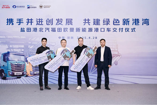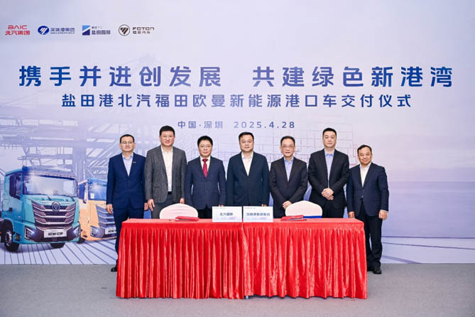 2025年4月28日,以“携手并进创发展 共建绿色新港湾“为主题的盐田港北汽福田欧曼新能源港口车交付仪式,在深圳盐田港隆重举行。来自深圳港集团、盐田国际、深圳市集装箱运输协会、北汽集团、北汽福田、北汽国际等领导嘉宾,及盐田港核心物流运输承运商等合作伙伴共同出席见证。活动中,北汽福田正式向盐田港交付欧曼新能源换电港口车,以创新的专业化、定制化产品,高效赋能绿色生态港口建设。同时,北汽国际和深圳港物流集团,北汽福田和盐田港内核心承运商签订了战略合作协议,多方将积极共享优势资源,以高质量发展共同推进盐田港绿色转型升级,合力打造零碳港口示范标杆。