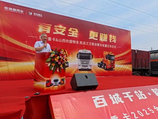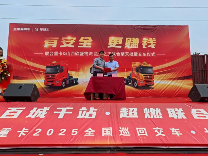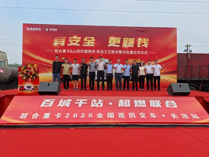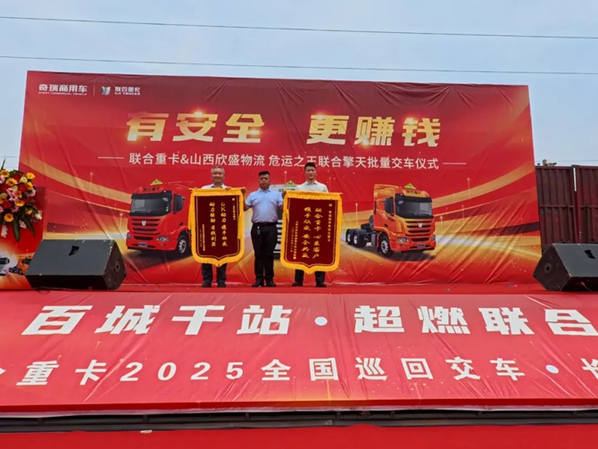 2025年6月20日,“百城千站 超燃联合”联合重卡2025全国巡回交车长治站顺利举行,技术奇瑞赋能下的联合重卡迎来了与山西欣盛物流关于危运之王联合擎天的批量交车,同时双方也进行了战略签约。此次产品的交付既是双方深化合作的重要实践,也是客户对联合重卡产品力的双重认可,为当地危化品运输转型升级注入全新动能。