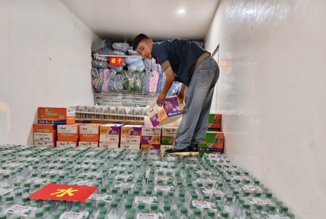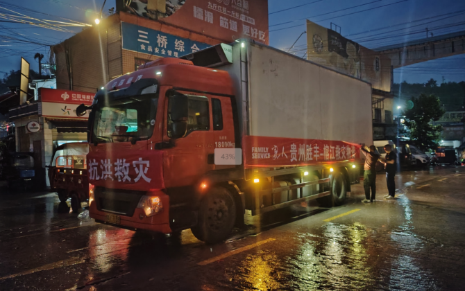 与此同时,参与救灾的服务站迅速备齐蓄电池、矿泉水、应急餐食等救援设备和救灾物资,整装待发,随时准备奔赴救灾一线。贵州胜丰服务站率先行动,备好100个折叠床等生活用品和方便食用的餐食物资,连夜驱车送往灾区,救助受灾人员300余人。“抗洪救灾”的红色条幅在车灯下泛着暖光——这不是普通的救援任务,而是一场与洪水赛跑的温情接力。