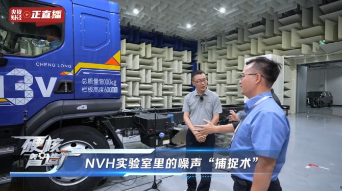 在NVH实验室,消声室的墙体采用双层隔声结构,内壁、顶部铺设吸声尖劈,可以将99%以上的声波反射消除,背景噪声可低至17分贝。在这里,工程师们通过噪声源定位、传递路径分析、响应分析等试验技术,对车辆进行“诊断”和优化。例如,乘龙M3燃油车怠速噪声大概在52分贝,相当于家里洗衣机工作的音量;时速80公里行驶时,车内噪声在64分贝以下,可以媲美乘用车SUV的静音水平。