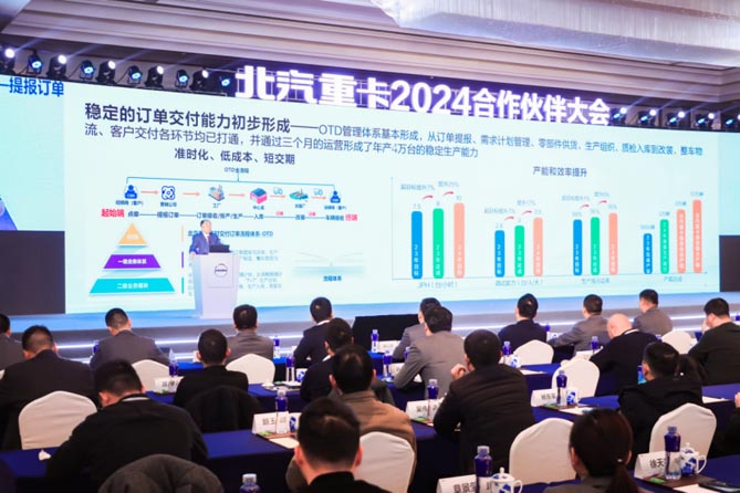 制造方面,北汽重卡依托中国首个数字孪生重卡工厂,将客户端、产品端、供应商端与工厂端全面打通,所有生产要素实现数字化,并在各端高效精确传递,同时通过大数据和智能算法,实现了排产、库存、人力资源、防错等生产要素的最优配置,真正做到了数字化赋能智能制造,最终实现单台成本降低20%,质量提升22%,交付满意度达到100%,已经形成年产4万台的稳定生产能力。其中OTD订单准时交付系统,交付全过程实现、可视化、透明化。