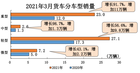 货车市场重轻型车是拉动商用车产销增长的主要力量。3月份,货车销售59.9万辆,同比增长68.1%。其中,重卡销量达到23万辆,同比增长91.7%;中卡销量达到2.6万辆,同比增长98.7%;轻卡销量达到27.1万辆,同比增长56.6%;微卡销量达到7.2万辆,同比增长43.1%。