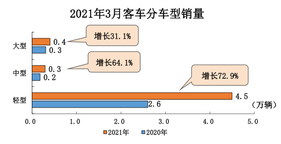 数据表明,3月商用车产销同比分别增长55.2%和68.1%。在商用车细分市场,3月与2月相比,货车和客车产销均呈高速增长势头;与上年同期相比,货车和客车产销同样保持快速增长,这里轻客车型表现优异,同比去年增长超过70%。