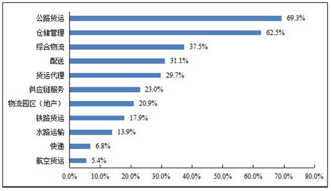 按照企业主营业务分类(包含企业兼营),69.3%的企业从事公路货运业务,62.5%的企业从事仓储管理业务,大部分物流企业仍然以运输和仓储为主营业务; 37.5%的 企业从事综合物流业务,23%的企业从事供应链服务,以一体化运作、网络化经营、融合化发展为特征的现代物流服务体系成为发展趋势(如图2所示)。