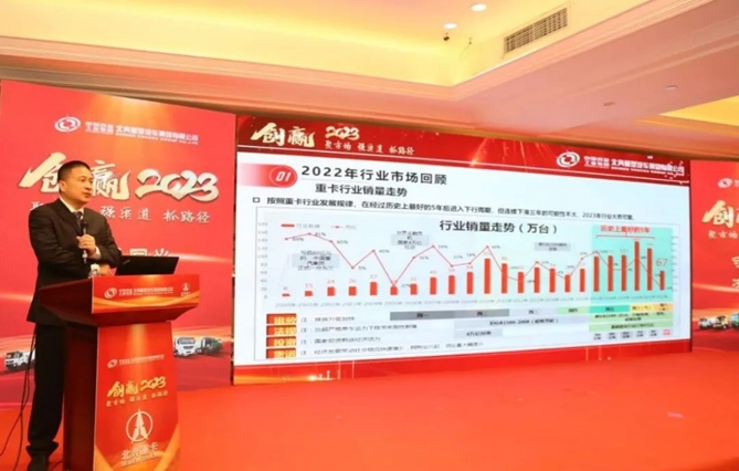 北奔重汽营销公司南部大区经理尹柏松围绕抢抓机遇、创新模式、互信发展、赢战市场四个方面,作《2023年南部大区商务年会主题报告》。紧盯新能源、能源运输、基建工程和燃气车四大市场机遇,围绕2023年公司的发展目标,深耕核心市场,聚焦优势产品,创新营销模式,开拓新能源市场。按照“政府培育、政策支撑,市场主导、产品支撑,场景先行、产业链协同,低碳绿色、包您满意”的工作方针,加快南部大区新能源产业布局,与产业链合作伙伴一起共同谱写新的辉煌篇章,全力实现全年销售目标,创赢2023!