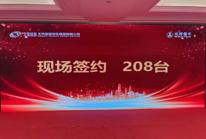 会后,尹柏松宣读《北奔重汽2023年南部大区商务年会现场签单政策》,南部区域经销商现场上台签约,本次南部大区商务年会现场订购208台!