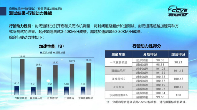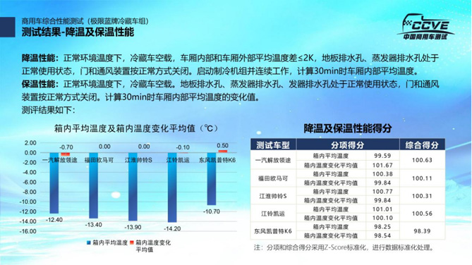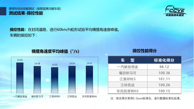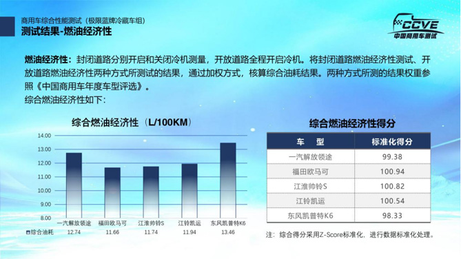 测试结束后,主办方根据测试数据,按照燃油经济性、驾乘舒适性、行驶动力性、制动性能、操控性能、降温及保温性能及用户评价七个维度计算出五款车型的测试得分。陈志强介绍说,本次测试活动从前期策划到测试全过程均立足于从消费者角度展开,各项指标结果,通过Z-score方式进行标准化处理,最终生成标准化得分,以便于物流用户进行参考。