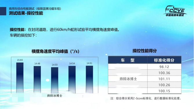 本次的测试活动中,在制动性能方面,冷链1号·帅铃冰博士冷藏车在封闭道路进行时速60公里至车辆静止制动距离测试,夺得第1;操控性能方面,冷链1号·帅铃冰博士冷藏车在封闭道路进行60km/h蛇形试验,车辆平均横摆角速度峰值最佳,稳居第1。