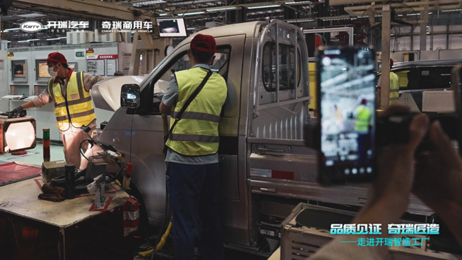在总装车间,我们可以看到开瑞“创富神车”如何组装与检测。在这里,喷涂好的外壳以及其他车间生产的配件全部从流水线运送到这里完成组装。大多数装配的工序都是由“机器人”完成,他们自如地运用全自动涂胶技术、全自动导航小车技术、全过程可控的加注技术、全流程可控的拧紧技术、先进的机器视觉技术等,为生产优质车辆提供了坚实的技术保障。身着统一制服的工人在岗位上或弯身装配,或蹲伏检测,或驾驶运送……整个车间有序工作的状态在传达着两个无形的信息:科技、效率。