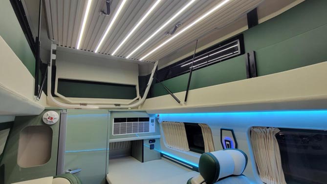 在不升顶的情况下,下方的一张纵置床也可以满足单人的睡眠,通过座椅的前移可延展达到1850mm*850mm;床尾上方安装了KME的房车变频空调,床下位置装有房车专用冰箱,床板下多余的空间就是整车的一个独立储物区域。