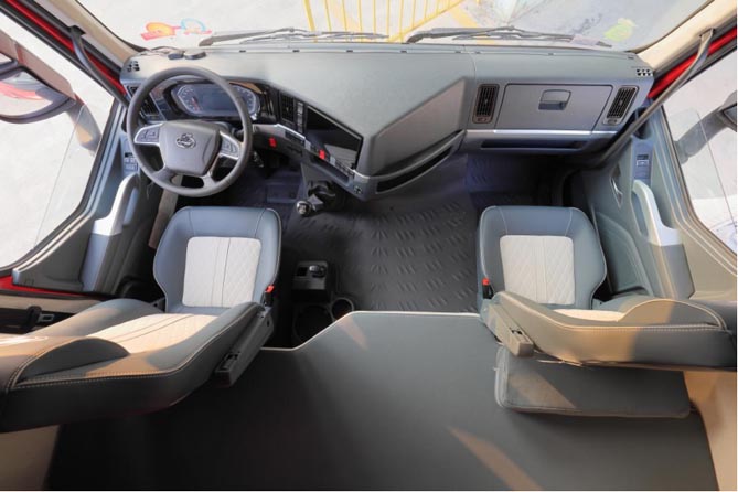 乘龙H5自动挡冷藏车的驾驶室采用高顶双卧平地板设计,拥有超大空间,内部高度达1.92米,卧铺达810mm,休息更舒适;搭载高端气囊减震座椅,环抱式仪表台、功能丰富的中控大屏与液晶仪表,为用户提供更便捷的驾驶体验。