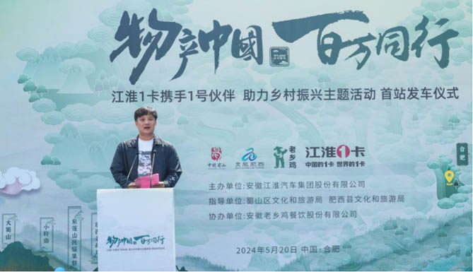 安徽省合肥市蜀山区文化和旅游局局长李正珊也对江汽集团成立60周年表示了祝贺,并表示文旅产业与乡村振兴是相辅相成的,“物产中国 百万同行”活动正是连接两者的桥梁,通过高效的物流支持,将乡村的特色物产和文旅资源送往全国各地。未来,合肥文旅将深化与江淮1卡的合作,共同推动文旅产业和乡村振兴的发展。